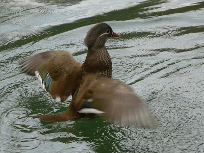 Et, cerise sur le gâteau, une petite femelle, ravissante, l'accompagnait. Si vous lisez la fiche Wikipedia vous apprendrez plein de choses sur ces animaux : ils sont originaires du Japon et on ne sait pas vraiment comment ils sont venus jusqu'ici en tout cas sans doute pas par leurs propres moyens. En chine, on s'offre les couples de canard mandarin comme gages de fidélité, les oiseaux formant un couple pour la vie.